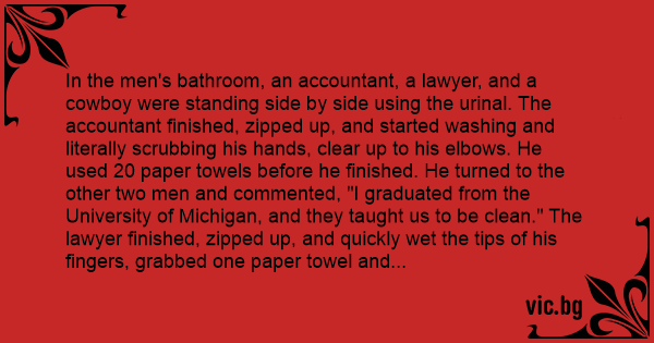 In the men's bathroom, an accountant, a lawyer, and a cowboy were standing side by side using the urinаl. The accountant finished, zipped up, and started washing and literally scrubbing his hands, clear up to his elbows. He used 20 paper towels before he finished. He turned to the other two men and commented, "I graduated from the University of Michigan, and they taught us to be clean." The lawyer finished, zipped up, and quickly wet the tips of his fingers, grabbed one paper towel and commented, "I graduated from the University of California, and they taught us to be environmentally conscious." The cowboy zipped up, and as he was walking out the door, he said, "I graduated from Texas Tech University, and they taught us not to рiss on our hands."