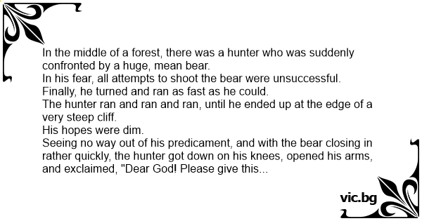 Seeing no way out of his predicament, and with the bear closing in rather quickly, the hunter got down on his knees, opened his arms, and exclaimed, "Dear God! Please give this bear some religion!"