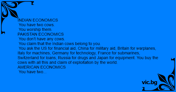 Какво е социализъм, комунизъм и капитализъм? Обясняваме с крави: Основни понятия Феодализъм: Имате 2 крави. Вашият господар прибира част от млякото. Социализъм: Имате 2 крави. Давате едната на съседа. Комунизъм: Имате 2 крави. Държавата прибира и двете крави и ви дава малко мляко....