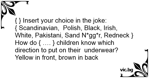 { } Insert your choice in the joke: { Scandinavian, Polish, Black, Irish, White, Pakistani, Sand N*gg*r, Redneck }