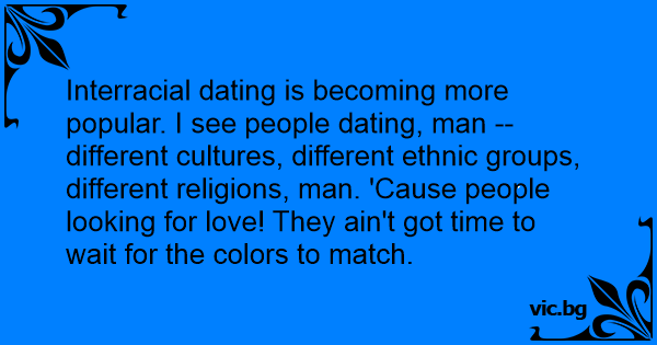 Interracial dating is becoming more popular. I see people dating, man -- different cultures, different ethnic groups, different religions, man. 'Cause people looking for love! They ain't got time to wait for the colors to match.