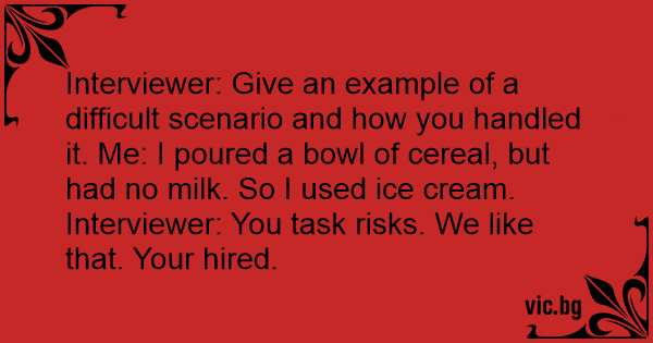 Interviewer: Give an example of a difficult scenario and how you handled it. Me: I poured a bowl of cereal, but had no milk. So I used ice cream.