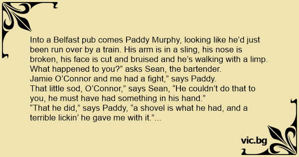 Into a Belfast pub comes Раddy Murphy, looking like he’d just been run over by a train. His arm is in a sling, his nose is broken, his face is cut and bruised and he’s walking with a limp.
