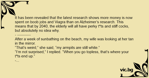 It has been revealed that the latest research shows more money is now spent on воов jobs and Viаgrа than on Alzheimer’s research. This means that by 2040, the elderly will all have perky t*ts and stiff соскs, but absolutely no idea why.