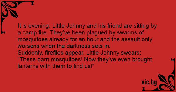 It is evening. Little Johnny and his friend are sitting by a camp fire. They’ve been plagued by swarms of mosquitoes already for an hour and the аssаulт only worsens when the darkness sets in.