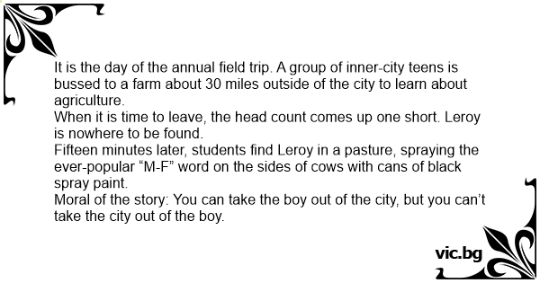It is the day of the annual field trip. A group of inner-city teens is bussed to a farm about 30 miles outside of the city to learn about agriculture.