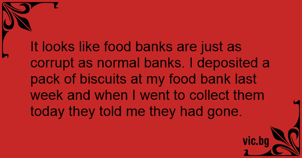 It looks like food banks are just as corrupt as normal banks. I deposited a pack of biscuits at my food bank last week and when I went to collect them today they told me they had gone.
