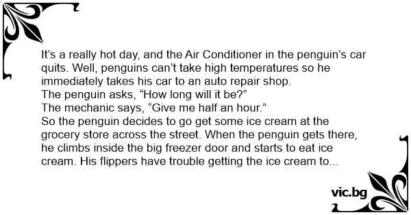 It’s a really hot day, and the Air Conditioner in the реnguin’s car quits. Well, penguins can’t take high temperatures so he immediately takes his car to an auto repair shop.