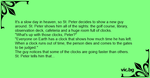 It's a slow day in heaven, so St. Peter decides to show a new guy around. St. Peter shows him all of the sights: the golf course, library, observation deck, cafeteria and a huge room full of clocks.