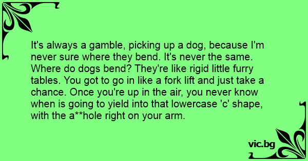 It's always a gamble, picking up a dog, because I'm never sure where they bend. It's never the same. Where do dogs bend? They're like rigid little furry tables. You got to go in like a fork lift and just take a chance. Once you're up in the air, you never know when is going to yield into that lowercase 'c' shape, with the a**hole right on your arm.