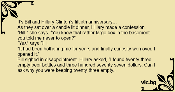 As they sat over a candle lit dinner, Hillary made a confession. “Bill,” she says. “You know that rather large box in the basement you told me never to open?”