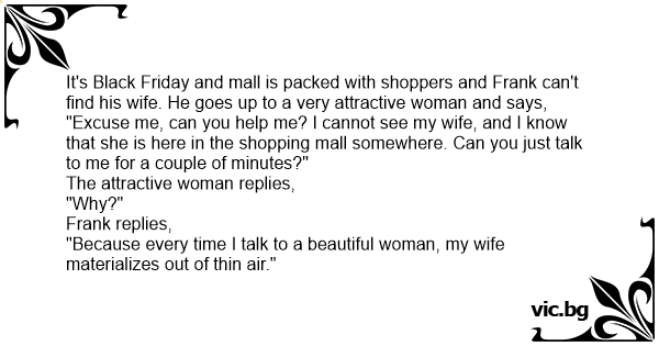 It's Black Friday and mall is packed with shoppers and Frank can't find his wife. He goes up to a very attractive woman and says,
