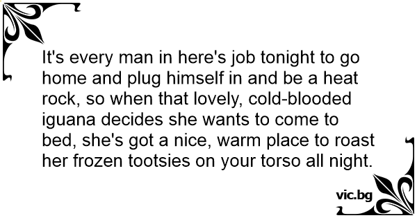It's every man in here's job tonight to go home and plug himself in and be a heat rock, so when that lovely, cold-blooded iguana decides she wants to come to bed, she's got a nice, warm place to roast her frozen tootsies on your torso all night.