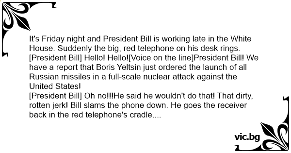 It's Friday night and President Bill is working late in the White House. Suddenly the big, red telephone on his desk rings.