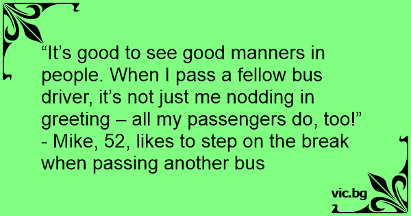 “It’s good to see good manners in people. When I pass a fellow bus driver, it’s not just me nodding in greeting – all my passengers do, too!”