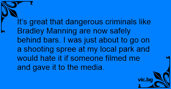 It’s great that dangerous criminals like Bradley Manning are now safely behind bars. I was just about to go on a shooting spree at my local park and would hate it if someone filmed me and gave it to the media.