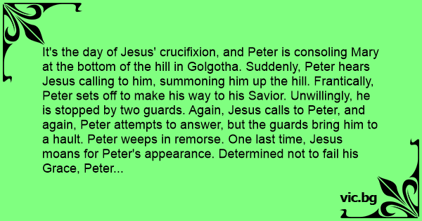 It's the day of Jesus' crucifixion, and Peter is consoling Mary at the bottom of the hill in Golgotha. Suddenly, Peter hears Jesus calling to him, summoning him up the hill. Frantically, Peter sets off to make his way to his Savior. Unwillingly, he is stopped by two guards. Again, Jesus calls to Peter, and again, Peter attempts to answer, but the guards bring him to a hault. Peter weeps in remorse. One last time, Jesus moans for Peter's appearance. Determined not to fail his Grace, Peter shoves past the standing guards and triumphantly stands at the bleeding feet of his King. "My Lord, anything for you. What is it, my King?"
