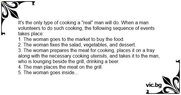 It's the only type of cooking a "real" man will do. When a man volunteers to do such cooking, the following sequence of events takes place: