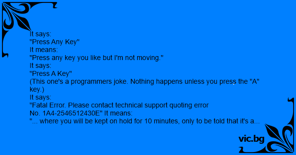 It says: "Press Any Key" It means: "Press any key you like but I'm not moving." It says: "Press A Key" (This one's a programmers joke. Nothing happens unless you press the "A" key.) It says: "Fatal Error. Please contact technical support quoting error No. 1A4-2546512430E" It means: "... where you will be kept on hold for 10 minutes, only to be told that it's a hardware problem." It says: "Installing program to C:\...." It means: "... And I'll also be writing a few files into c:\windows and c:\windows\system where you'll NEVER find them." It says: "Please insert disk 11" It means: "Because I know dаrn well there are only 10 disks." It says: "Not enough memory" It means: "I don't CARE if you've got 64MB of RAM, I want to use the bit below 640K." It says: "Cannot read from drive D:...." It means: "... However, if you put the CD in right side up..." It says: "Please Wait...." It means: "... Indefinitely." It says: "Directory does not exist...." It means: ".... any more. Whoops." It says: "The application caused an error. Choose Ignore or Close." It means: ".... Makes no difference to me, you're still not getting your work back."