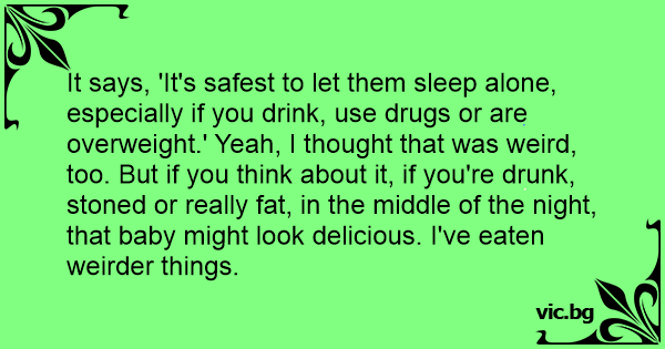 It says, 'It's safest to let them sleep alone, especially if you drink, use drugs or are overweight.' Yeah, I thought that was weird, too. But if you think about it, if you're drunк, sтоnеd or really fат, in the middle of the night, that baby might look delicious. I've eaten weirder things.