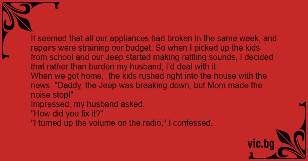 When we got home, the kids rushed right into the house with the news. "Daddy, the Jeep was breaking down, but Mom made the noise stop!"