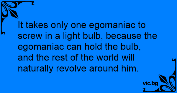 It takes only one egomaniac to sсrеw in a light bulb, because the egomaniac can hold the bulb, and the rest of the world will naturally revolve around him.