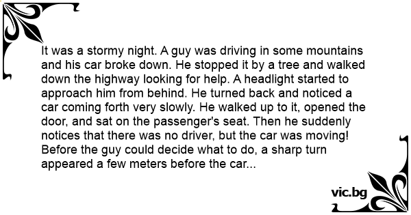 It was a stormy night. A guy was driving in some mountains and his car broke down. He stopped it by a tree and walked down the highway looking for help. A headlight started to approach him from behind. He turned back and noticed a car coming forth very slowly. He walked up to it, opened the door, and sat on the passenger's seat. Then he suddenly notices that there was no driver, but the car was moving!