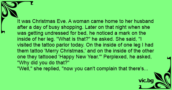 It was Christmas Eve. A woman came home to her husband after a day of busy shopping. Later on that night when she was getting undressed for bed, he noticed a mark on the inside of her leg. "What is that?" he asked. She said, "I visited the tattoo parlor today. On the inside of one leg I had them tattoo 'Merry Christmas,' and on the inside of the other one they tattooed 'Happy New Year.'" Perplexed, he asked, "Why did you do that?"
