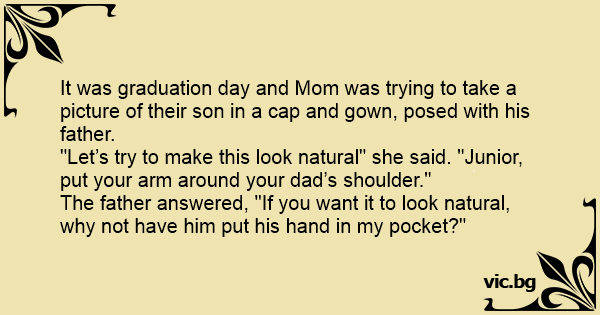 It was graduation day and Mom was trying to take a picture of their son in a cap and gown, posed with his father.
