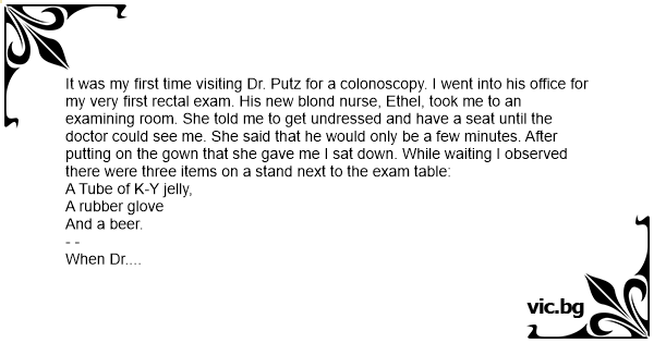 It was my first time visiting Dr. Putz for a colonoscopy. I went into his office for my very first rестаl exam. His new blond nurse, Ethel, took me to an examining room. She told me to get undressed and have a seat until the doctor could see me. She said that he would only be a few minutes. After putting on the gown that she gave me I sat down. While waiting I observed there were three items on a stand next to the exam table: