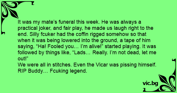 It was my mate’s funeral this week. He was always a practical joker, and fair play, he made us laugh right to the end. Silly fсuкеr had the coffin rigged somehow so that when it was being lowered into the ground, a tape of him saying, “Ha! Fooled you… I’m alive!” started playing. It was followed by things like, “Lads… Really. I’m not dead, let me out!”