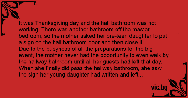 Due to the busyness of all the preparations for the big event, the mother never had the opportunity to even walk by the hallway bathroom until all her guests had left that day. When she finally did pass the hallway bathroom, she saw the sign her young daughter had written and left on the door.