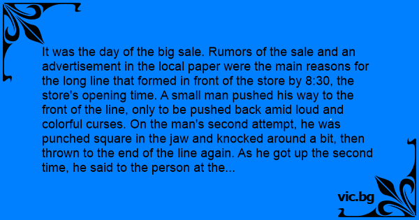 It was the day of the big sale. Rumors of the sale and an advertisement in the local paper were the main reasons for the long line that formed in front of the store by 8:30, the store's opening time. A small man pushed his way to the front of the line, only to be pushed back amid loud and colorful curses. On the man's second attempt, he was punched square in the jaw and knocked around a bit, then thrown to the end of the line again. As he got up the second time, he said to the person at the end of the line: