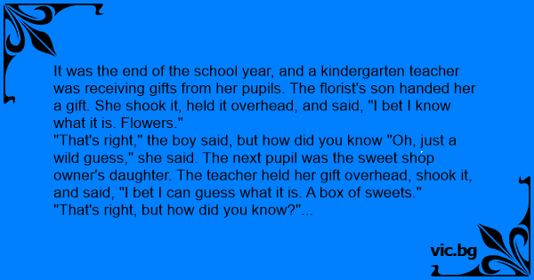 It was the end of the school year, and a kindergarten teacher was receiving gifts from her pupils. The florist's son handed her a gift. She shook it, held it overhead, and said, "I bet I know what it is. Flowers."