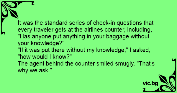It was the standard series of check-in questions that every traveler gets at the airlines counter, including, "Has anyone put anything in your baggage without your knowledge?"