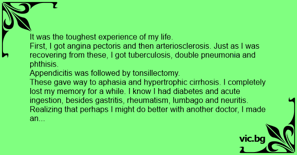 First, I got angina pectoris and then arteriosclerosis. Just as I was recovering from these, I got tuberculosis, double pneumonia and phthisis.