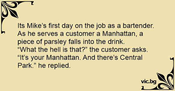 Its Mike’s first day on the job as a bartender. As he serves a customer a Manhattan, a piece of parsley falls into the drink.
