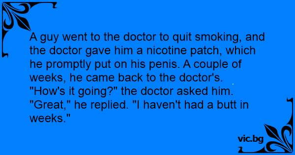 A guy went to the doctor to quit smoking, and the doctor gave him a nicotine patch, which he promptly put on his реnis. A couple of weeks, he came back to the doctor's.