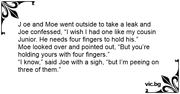 J oe and Moe went outside to take a leak and Joe confessed, “I wish I had one like my cousin Junior. He needs four fingers to hold his.”
