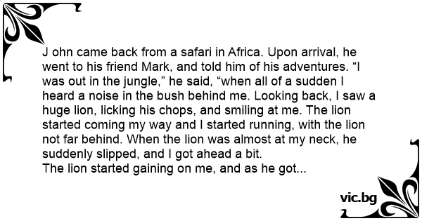 O sujeito volta de um safari e comenta suas aventuras com um amigo: — Rapaz! Eu estava no meio da selva, quando de repente ouço um barulho. Olho para trás e vejo um leão enorme, lambendo os beiços....