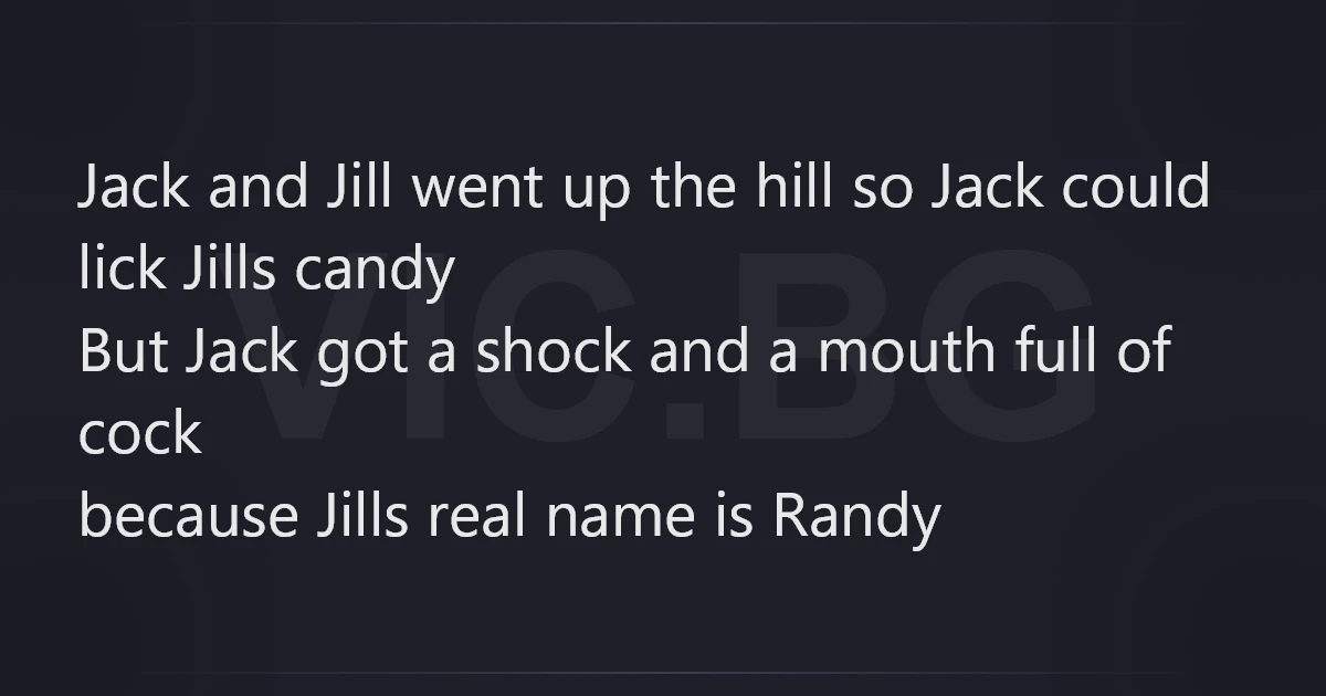 Jack and Jill went up the hill so Jack could liск Jills candy<br />But Jack got a shock and a mouth full of cock<br />because Jills real name is Randy