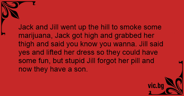 Jack and Jill went up the hill to smoke some marijuana, Jack got high and grabbed her thigh and said you know you wanna. Jill said yes and lifted her dress so they could have some fun, but sтuрid Jill forgot her pill and now they have a son.