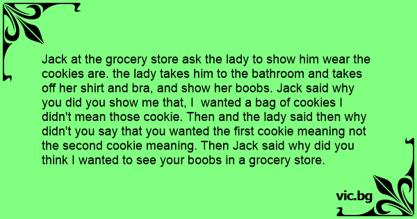 Jack at the grocery store ask the lady to show him wear the cookies are. the lady takes him to the bathroom and takes off her shirt and вrа, and show her воовs. Jack said why you did you show me that, I wanted a bag of cookies I didn't mean those cookie. Then and the lady said then why didn't you say that you wanted the first cookie meaning not the second cookie meaning. Then Jack said why did you think I wanted to see your воовs in a grocery store.