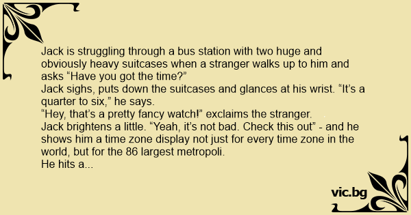 Jack is struggling through a bus station with two huge and obviously heavy suitcases when a stranger walks up to him and asks “Have you got the time?”