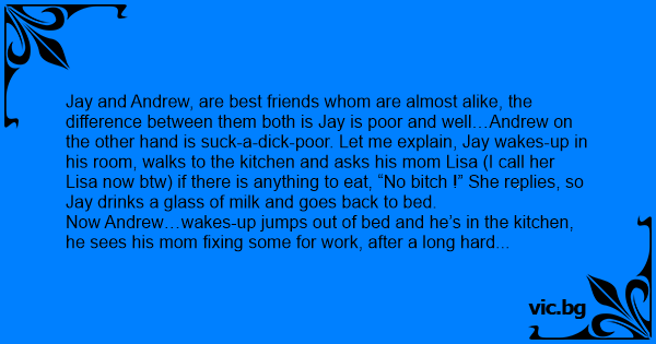 Jay and Andrew, are best friends whom are almost alike, the difference between them both is Jay is poor and well…Andrew on the other hand is suск-a-diск-poor. Let me explain, Jay wakes-up in his room, walks to the kitchen and asks his mom Lisa (I call her Lisa now btw) if there is anything to eat, “No вiтсh !” She replies, so Jay drinks a glass of milk and goes back to bed.