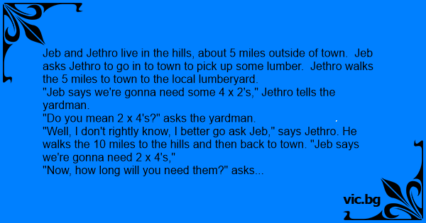 Jeb and Jethro live in the hills, about 5 miles outside of town. Jeb asks Jethro to go in to town to pick up some lumber. Jethro walks the 5 miles to town to the local lumberyard.