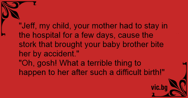 "Jeff, my child, your mother had to stay in the hospital for a few days, cause the stork that brought your baby brother bite her by accident."