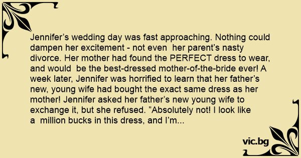 Jennifer’s wedding day was fast approaching. Nothing could dampen her excitement - not even her parent’s nasty divorce. Her mother had found the PERFECT dress to wear, and would be the best-dressed mother-of-the-bride ever! A week later, Jennifer was horrified to learn that her father’s new, young wife had bought the exact same dress as her mother! Jennifer asked her father’s new young wife to exchange it, but she refused. ”Absolutely not! I look like a million bucks in this dress, and I’m wearing it,” she replied. Jennifer told her mother who graciously said, ”Never mind sweetheart. I’ll get another dress. After all, it’s your special day.”
