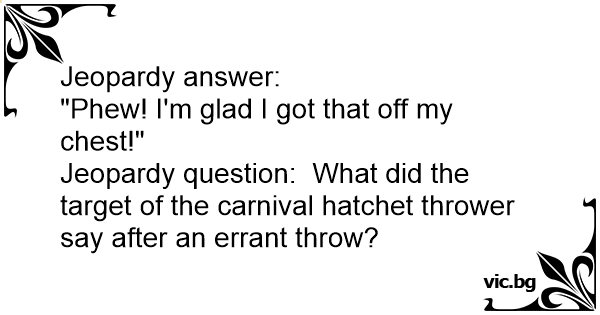 Jeopardy question: What did the target of the carnival hatchet thrower say after an errant throw?
