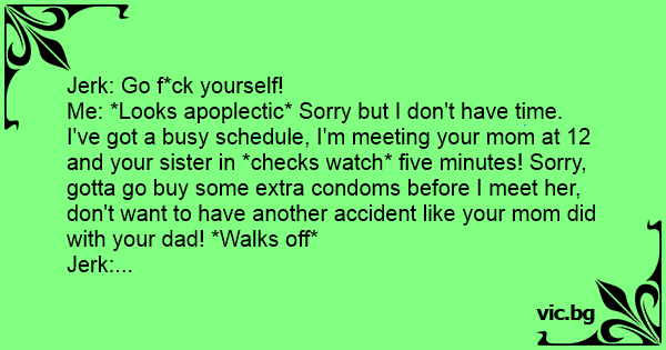 Me: *Looks apoplectic* Sorry but I don't have time. I've got a busy schedule, I'm meeting your mom at 12 and your sister in *checks watch* five minutes! Sorry, gotta go buy some extra condoms before I meet her, don't want to have another accident like your mom did with your dad! *Walks off*